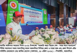 সারা দেশের ন্যায় ময়মনসিংহেও জেলা লিগ্যাল এইড কমিটির আয়োজনে যথাযথ মর্যাদায় জাতীয় আইনগত সহায়তা দিবস-২০২৬ উদযাপিত হয়েছে। সরকারি আইনগত সহায়তা কার্যক্রমের প্রচার ও প্রসারের লক্ষ্যে প্রতিবছর ব্যাপক উৎসাহ-উদ্দীপনার মধ্য দিয়ে দিবসটি যথাযোগ্য মর্যাদায় পালন করা হয়। দিবসটি উপলক্ষে আজ মঙ্গলবার জেলা ও দায়রা জজ আদালত প্রাঙ্গণ থেকে এক বর্ণাঢ্য র্যালির আয়োজন করা হয়েছে। ময়মনসিংহ জেলা লিগ্যাল এইড কমিটির চেয়ারম্যান এবং সিনিয়র জেলা ও দায়রা জজ মোঃ জাকির হোসেনের নেতৃত্বে সকাল সাড়ে আটটায় র্যালিটি জেলা ও দায়রা জজ আদালত প্রাঙ্গন থেকে টাউন হলে গিয়ে শেষ হয়। র্যালি শেষে এডভোকেট তারেক স্মৃতি অডিটোরিয়ামে ”সরকারি খরচে বিরোধ শেষ, সবার আগে বাংলাদেশ” শীর্ষক আলোচনা সভা অনুষ্ঠিত হয়। সভাপতির বক্তব্যে লিগ্যাল এইড কমিটির চেয়ারম্যান বলেন, একসময় দেশে আইনগত সহায়তার উদ্যোগ মূলত বেসরকারি সংস্থাগুলোর মাধ্যমে পরিচালিত হতো। সরকারি পর্যায়ে আইনগত সহায়তা কার্যক্রমের প্রাথমিক কাঠামো যথেষ্ট সীমাবদ্ধ ছিল বলেও তিনি উল্লেখ করেন। অতীতে দরিদ্র মানুষের জন্য আইনি সহায়তার সুযোগ থাকলেও তা ছিল অকার্যকর ও বাস্তবতার সঙ্গে অসামঞ্জস্যপূর্ণ। বাংলাদেশে রাষ্ট্রীয়ভাবে আইনগত সহায়তার ধারণাকে কার্যকর রূপ দেন সাবেক প্রধানমন্ত্রী বেগম খালেদা জিয়া। তাঁর সময়েই একটি কমিটি গঠন এবং তহবিল সৃষ্টির মাধ্যমে অসচ্ছল ও সুবিধাবঞ্চিত মানুষের জন্য আইনি সহায়তার পথ সুগম হয়। সভাপতি আরও উল্লেখ করেন, বর্তমান সময়ে প্রধানমন্ত্রী তারেক রহমান আইনগত সহায়তা কার্যক্রমকে আরও গতিশীল করার উদ্যোগ নিয়েছেন। তিনি জোর দিয়ে বলেন, আইনগত সহায়তা শুধু মামলা পরিচালনায় সীমাবদ্ধ নয়, এটি আইনি পরামর্শ, বিকল্প বিরোধ নিষ্পত্তি এবং সাধারণ মানুষের ন্যায়বিচার নিশ্চিত করার একটি কার্যকর মাধ্যম।সভাপতি জানান, জেলা লিগ্যাল এইড অফিসে ধনী-গরিব নির্বিশেষে সবাই সেখানে আইনি পরামর্শ নিতে পারেন। পরামর্শ গ্রহণে কোনো আর্থিক সীমাবদ্ধতা নেই। তিনি আশাবাদ ব্যক্ত করেন যে, সম্মিলিত প্রচেষ্টায় দেশের অসহায়, দরিদ্র ও ন্যায়বিচারপ্রার্থী মানুষের আইনগত অধিকার নিশ্চিত করার এই মহৎ কর্মসূচি ভবিষ্যতে আরও শক্তিশালী ও কার্যকর হবে।ময়মনসিংহ সিটি কর্পোরেশনের প্রশাসক মোঃ রুকুনোজ্জামান রোকন বলেন, এই দেশ স্বাধীন হয়েছে মানুষের অধিকার প্রতিষ্ঠার জন্য, আইনের শাসন নিশ্চিত করার জন্য। ১৯৭১ সালের মহান মুক্তিযুদ্ধের মূল চেতনাই ছিল মানুষের মুক্তি। কিন্তু আজও যদি একজন সাধারণ মানুষ, একজন অসহায় কৃষক মনে করেন যে আইন কেবল বিত্তবান, সমাজপতি কিংবা প্রভাবশালীদের জন্য, তবে তা আমাদের রাষ্ট্র ও সমাজের জন্য গভীর উদ্বেগে